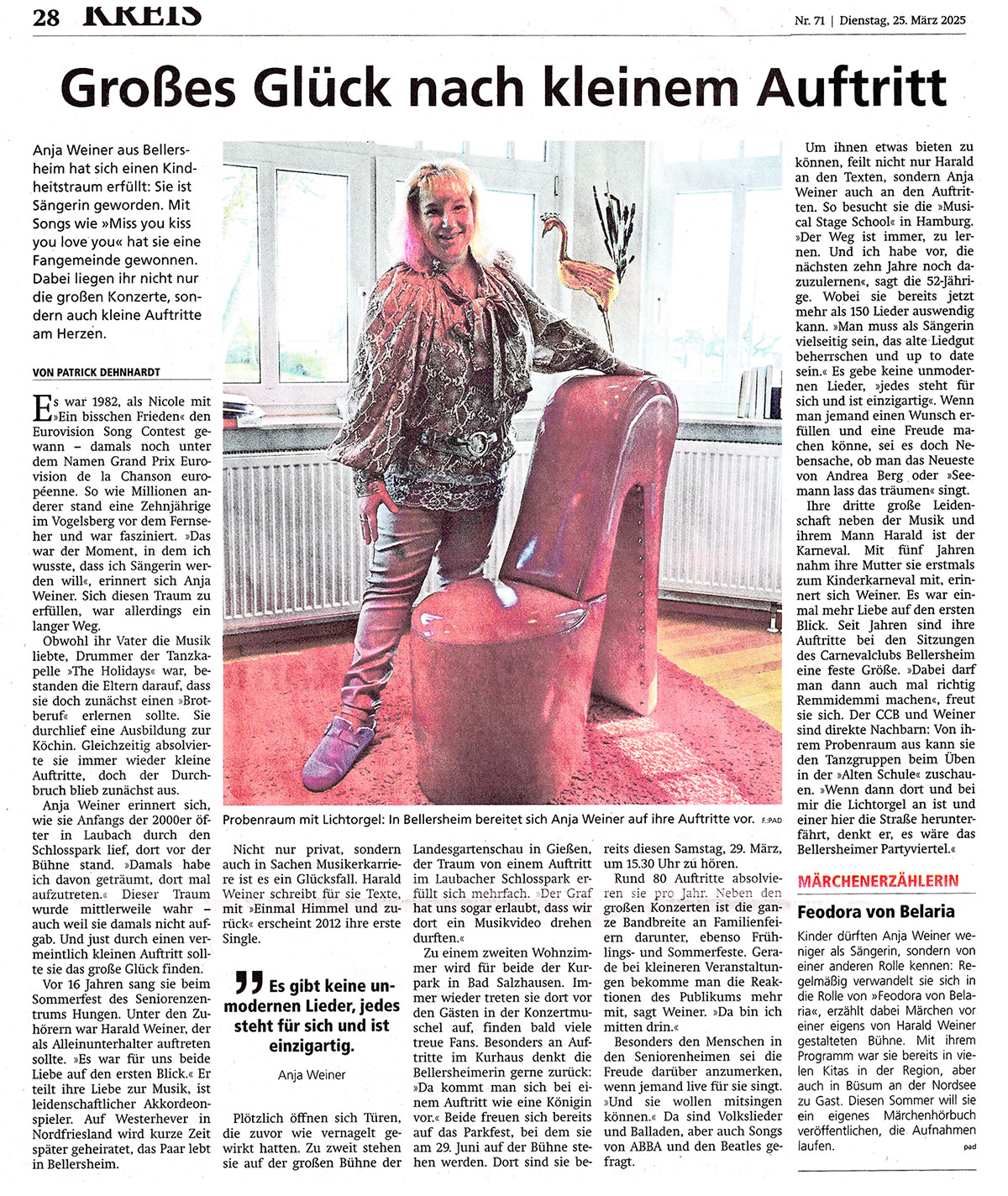 Telefon (AB) 06402 50 56 64 Konzerte von Anja Weiner sind einfach wunderbar.Unter dem Titel „100% Schlager“ singt Anja „Schlagerklassiker von Liebe, Schokolade und anderen Überraschungen“.Mit breitgefächertem musikalischem Talent möchte sie gemeinsam mit ihrem Publikum jedes Konzert frisch gestalten. Ihr Repertoire aus verschiedenen musikalischen Epochen begeistert ihr Publikum. Seit frühester Kindheit wächst Anjas Liebe und Leidenschaft zur Musik. Ab ihrem sechsten Lebensjahr trat sie regelmäßig vor Publikum auf. Die Herzen der Konzertbesucher mit ihren Auftritten zu erobern und zu begeistern bereitet ihr großen Spaß. Neben mehreren CD- Produktionen in den letzten Jahren hat sie u .a. die Musical Stage school in Hamburg besucht. „Ich freue mich auf Euer Kommen“-so Anja. Die hier hinterlegten Logos können Sie für Ihre Presseveröffentlichungen per rechtem Mausklick + "Grafik speichern unter" entnehmen.